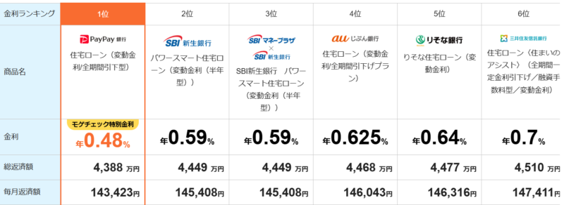 借りられる住宅ローンをランキング形式で表示してくれるので、金利や商品情報が比較しやすいです。